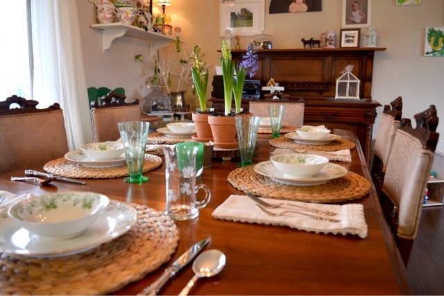 Over in the dining room I have some more bits of green, like a shamrock teapot I found at HomeGoods, Ellie's holiday canvases and then my moms vintage green china set. The crystal shamrock mugs were a staple on my birthday growing up and I remember my mom serving me green milk for breakfast in bed in them. The green glasses are also vintage that were given to me years ago for my birthday as well...good thing I have embraced my inner Irish ;)