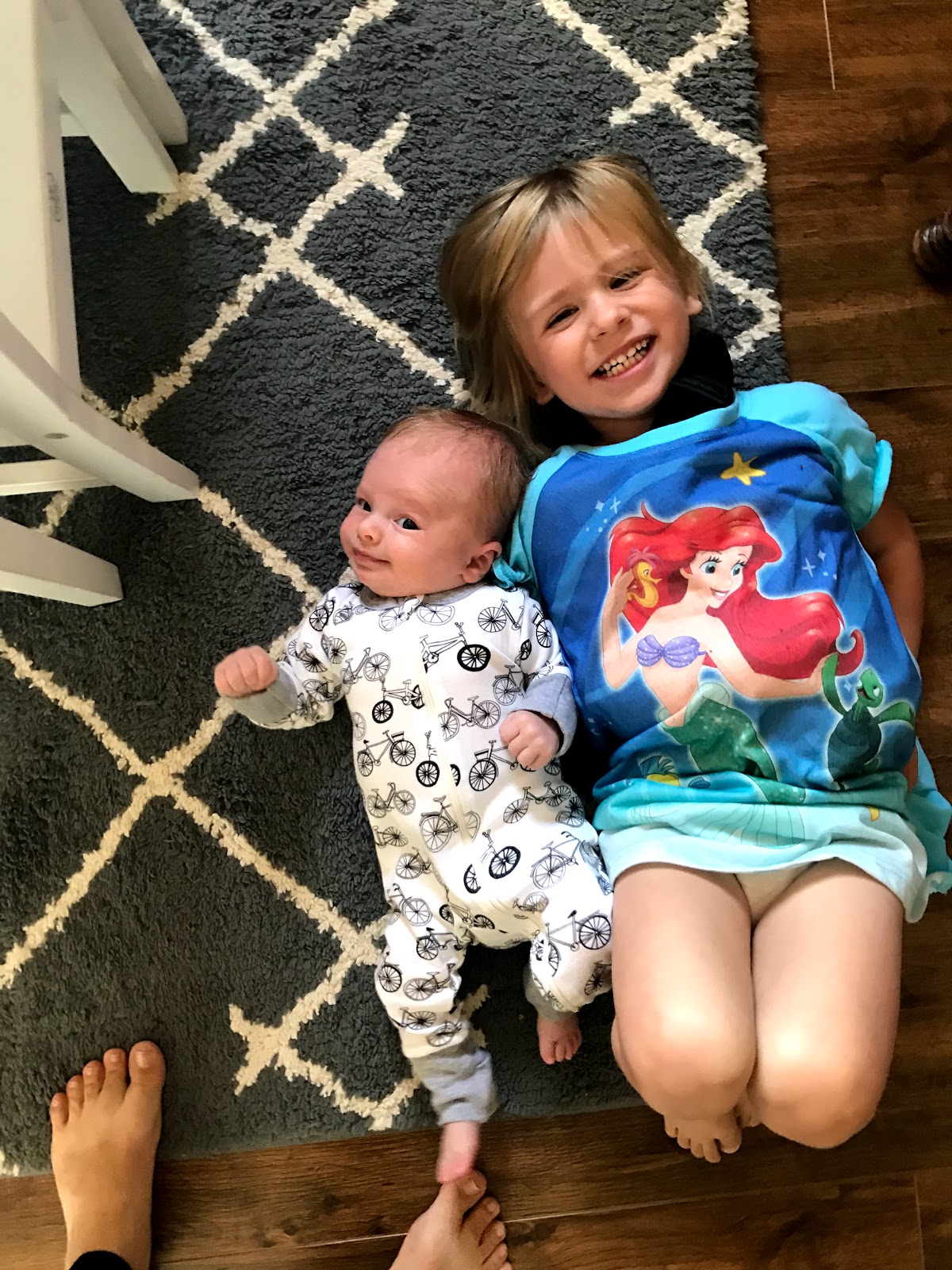 Sisters: they are still OBSESSED with little bro! Ellie is constantly giving him kisses, telling him she loves him all the time and wants to be a part of his every waking hour!! Ellie is so ready for school to start and keeps asking if she gets to go to Kindergarten "in the morning". Finnley is always the first to alert us that "Baby crying" insists on touching him at all times (not always gently), rarely wants him out of her sight, and gets quite irritated that she isn't allowed to bug him while he is sleeping. Finnley is a champ with her new sling and has adjusted quite well to missing an arm, she gets to be in the sling for 3 weeks and then we will have another Xray to check on its progress.