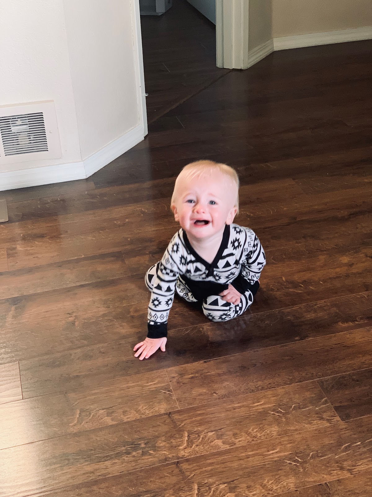 Does: crawls around wanting to be attached to me...must be the teeth. Then he is getting into the kids drawer in our kitchen and pulling out all the cups and plates. I'm still working on eliminating all the plastics, it is a process for sure and am on the lookout for some non plastic plates for the kids...I keep thinking I want some sort of stainless steel so I just need to figure out where I can get those from. He is standing and pulling himself up on all the things.